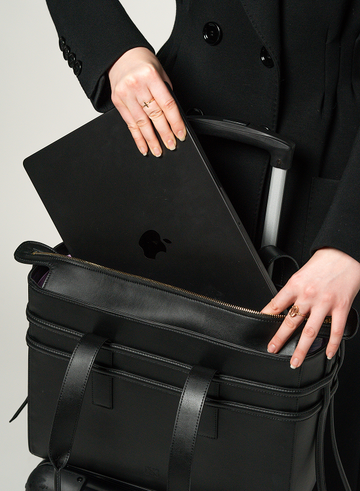 Crafted in Italy from plant-based Italian leather, this structured tote combines softness with functionality. It comfortably fits a 16’’ laptop and includes multiple organizational features—a secure zip pocket, key leash, and a dedicated water bottle pocket. The spacious interior holds everything you need for work, travel, or a busy day out, and it’s perfectly sized to slide under most airline seats. Finished with a secure zip closure and comfortable top handles, it balances edgy style with everyday practicality.
