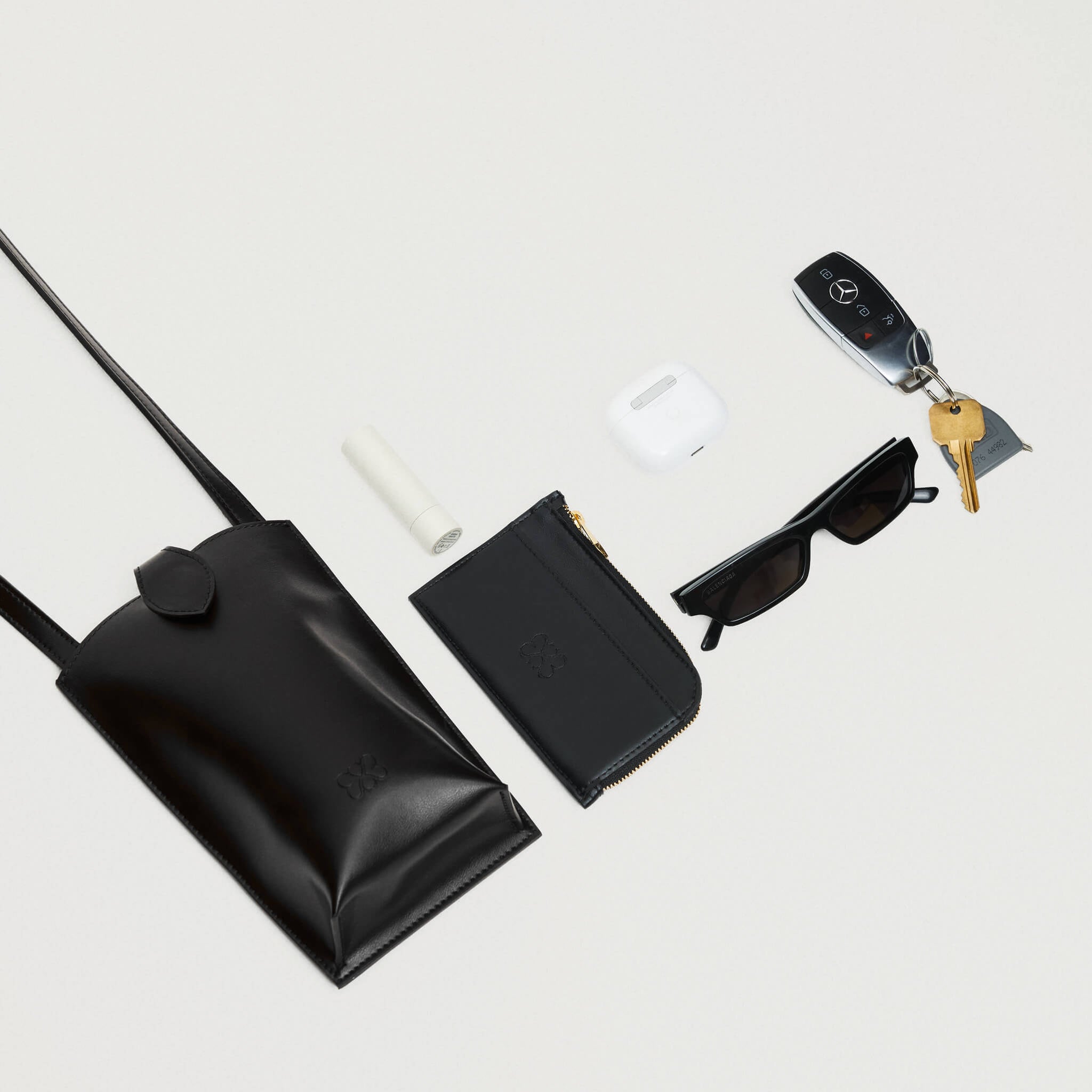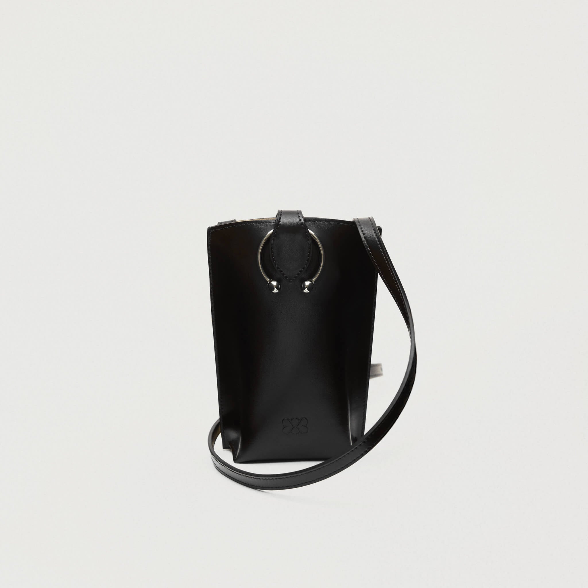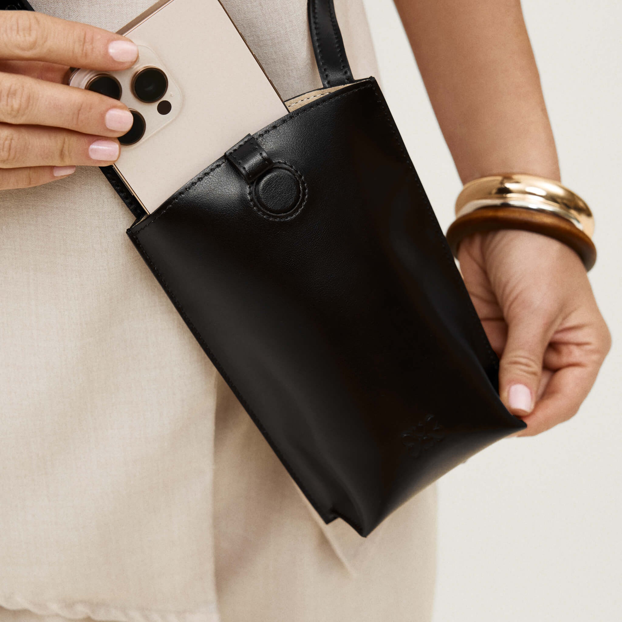 Inside, a dedicated compartment separates your phone from other essentials — keys, lipstick, glasses, or cards — so everything stays organized and easy to reach. A magnetic closure and adjustable strap keep your hands free, while optional add-on gold or silver rings (sold separately) let you elevate the look for dressier occasions.